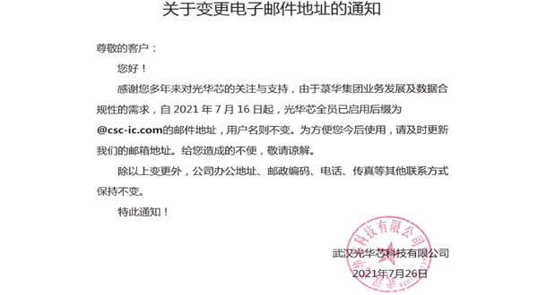 尊敬的客戶:您好!感謝您多年來對光華芯的關注與支持,由于菉華集團業務發展及數據合規性的需求,自2021 年7 月16 日起,光華芯全員己啟用后綴為@csc-ic.com的郵件地址,用戶名則不變。為方便您今后使用,請及時更...